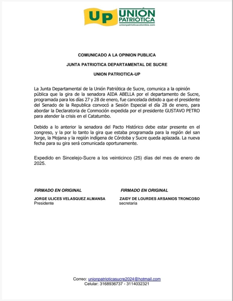 La Junta Departamental de la Unión Patriótica de Sucre, comunicó a la opinión pública que la gira de la senadora Aída Avella por el departamento de Sucre, programada para los días 27 y 28 de enero, fue cancelada debido a que el presidente del Senado de la República convocó a Sesión Especial el día 28 de enero.